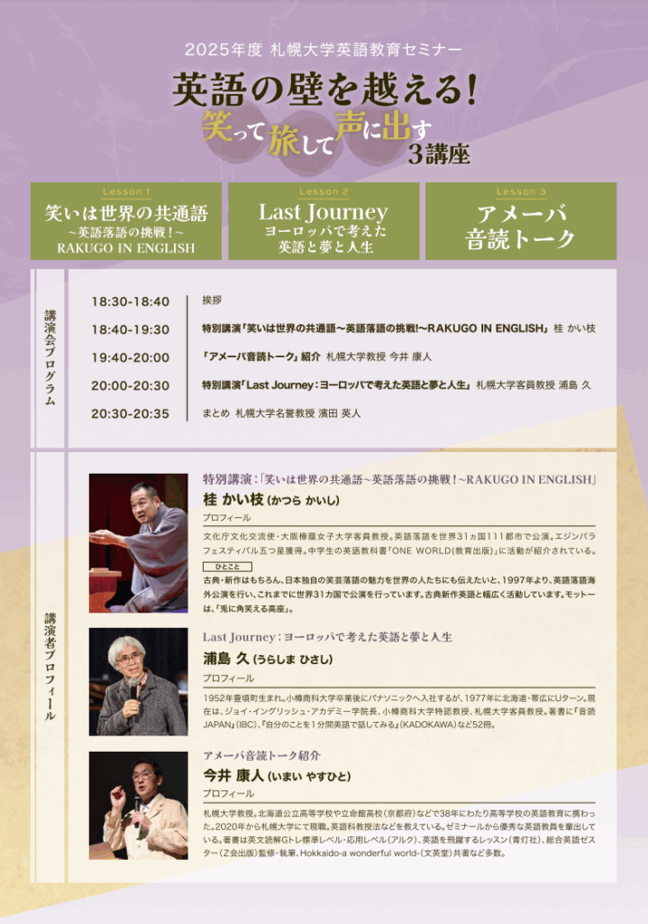 Wednesday, September 3rd, 6:30 PM At Sapporo University, 1st Floor Prea Hall. Participation fee is free (registration required).